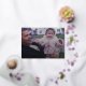 A modern look for a holiday photo card. A gold foil word - merry - is on top of the photo and holiday greeting. Botanical leaves are included on the back.
