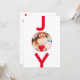 A simple modern minimalist Christmas card in red and white. On the front: A chic white background, with the word JOY written with red bold letters. The letter O is used as a photo frame. Personalise and add your own family photo. Back: White background and red text. Add your own holiday greetings and family name(s). The letters in the word JOY as decoration.