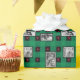 A custom photo wrapping paper with red hearts, green and black buffalo plaids with dots. Pick 4 photographs of family, friends, pets or anything the person who's gift you will wrap it in will enjoy. Make the wrapping as much of a gift as the item you're giving.