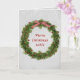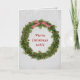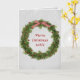 Merry Christmas greeting with red light string and gingham bow decorating green pine wreath.