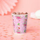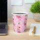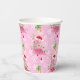 Pink Christmas flamingos wearing string lights and a Santa hat on a pink background with snowflakes and festively decorated palm trees. It's a cute pattern for celebrating Christmas with a tropical vibe! Shown here on customisable paper party cups with optional lids. You can easily resize the pattern to your preference and select your favourite background colour. Great for Christmas parties at home, school, or the office!