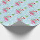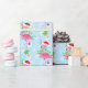 Pink Christmas flamingos wearing string lights and a Santa hat on a pastel blue background with snowflakes and festively decorated palm trees. Shown here on customisable gift wrapping paper. You can easily resize the pattern to your preference and select your favourite background colour. It's a cute pattern for celebrating Christmas with a tropical vibe!