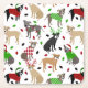 Cute Christmas Pitbull dogs with black, fawn, brindle, blue and red coat colours dressed in festive holiday outfits, Santa hats and argyle sweaters with scattered Christmas ornaments pattern.