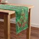 Christmas Table Runner in Green with Red, Gold, White. A sparkling Christmas Tree and the words, "Merry Christmas" makes this great for holiday entertaining.