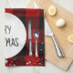 Snowman on Merry Christmas text on a white plate and silverware with red and black buffalo plaid background and snowflakes
