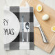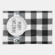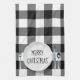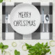 Merry Christmas text on a round white plate and silverware with white and black buffalo plaid background.