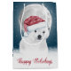 Polar bear with Christmas Santa Claus cap on dark blue night sky with snowflakes and full moon.