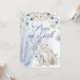 Magical winter scene watercolor Christmas Card with woodland polar bear animal with snow foliage and floral washed with blues and greens. Typography in deep blue "Peace on Earth"