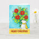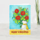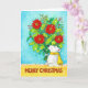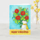 On the right hand side of this card, a polar bear is holding a giant bouquet of red Poinsettias, a traditional christmas flower often used in floral decoration at winter time. The little bear is wearing a bright yellow scarf, fastened witha simple knot at the back of his neck. He is standing before a blue blackground and on a yellow flower on which is written in hand written letters "Merry Christmas". The letters are brown. Tiny white snowflakes are scattered over the painting.