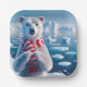 A polar bear wearing a red and white striped scarf stands on a glacier forming a heart shape with its paws