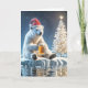 A polar bear wearing a Santa hat holds a mug of beer while sitting on an ice floe next to a decorated Christmas tree.
