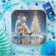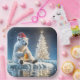 A polar bear wearing a Santa hat holds a mug of beer while sitting on an ice floe next to a decorated Christmas tree