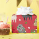 Cute Christmas dogs in festive holiday outfits. Pomeranians with cream, black, tan, grey and chocolate coats wear Santa hats, antlers, sweaters on a red background with scattered ornaments pattern.