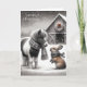 In a snowy winter scene, a pony and a rabbit wearing cosy scarves stand together in front of a barn adorned with a Christmas wreath