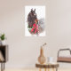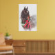 Christmas Pony - a dark bay wearing a wreath with a red bow and jingle bells, with snow falling. A precious Christmas time image suitable for Christmas decor in a horsey home or a tack room.