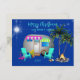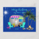 Camping themed, Christmas postcard greeting. A little silver camper is the design on easy to customise postcards. Palm trees are decorated with lights and two turquoise blue chairs are set up by the campfire, while stars shine in the sky. Flamingos and a seashell complete the tropical design. Include a mailing address on the back if you wish. Each postcard will need to be customised separately for addresses. Once a card has been added to your cart, click on it to go back to the product page and customise the next one.
