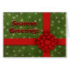 A festive red ribbon against a green Christmas paper. The words Seasons Greetings at the top. A simple and a bit traditional card for the holidays.