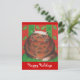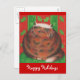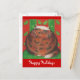 A happy tortoiseshell cat (resembling a christmas pudding!) sits on a green cushion against a red and green holly leaf patterned background. Postcard with a customisable design for you to personalise with your own text, images and ideas. The text can easily be changed using the template provided or click the 'Customise It' button to make further alterations. An original coloured-pencil drawing by Jess Perry.