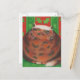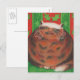 A happy tortoiseshell cat (resembling a christmas pudding!) sits on a green cushion against a red and green holly leaf patterned background. Postcard with a customisable design for you to personalise with your own text, images and ideas. An original coloured-pencil drawing by Jess Perry.