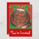 A happy tortoiseshell cat (resembling a christmas pudding!) sits on a green cushion against a red and green holly leaf patterned background. Invitation with a red, green and white customisable design for you to personalise with your own text, images and ideas. An original coloured pencil drawing by Jess Perry.