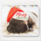 A mouse pad for the festive season! Illustrated with an adorable photo of a pug puppy sleeping while wearing a santa hat. Merry Christmas is written on the band of his hat, in a trendy handwritten font. Christmas lights strung along the top of this cute photo.