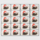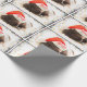 Wrapping paper with an adorable photo of a pug puppy sleeping while wearing a santa hat. Merry Christmas is written on the band of his hat, in a trendy handwritten font. A grunge border with colourful Christmas lights surround the frame of this cute photo.