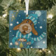 A cute Holiday glass ornament with a cartoon dog enjoying a hot cup of cocoa topped with some tiny marshmallows .