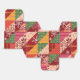Patchwork of Christmas patterns in festive colours featuring candy canes, ornaments and snowflakes.
