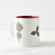 Four squares in green and tan are adorned with red ornaments decorated with white snowflakes and green holly with red berries. White stitching adds a decorative touch, giving the repeating pattern the appearance of a quilt, creating a perfectly cosy feeling for the Christmas holiday. The shape of a teardrop ornament creates a mask for the design to add a final seasonal touch.