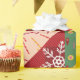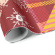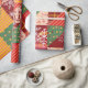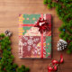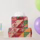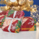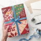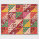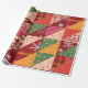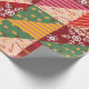 Patchwork design of holiday prints. Dancing candy canes, hanging ornaments, and falling snowflakes come together in a fun bright cheater quilt pattern.