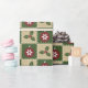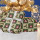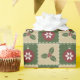 Four squares in green and tan are adorned with red ornaments decorated with white snowflakes and green holly with red berries. White stitching adds a decorative touch, giving the repeating pattern the appearance of a quilt, creating a perfectly cosy feeling for the Christmas holiday.