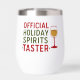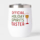 Quote: Official Holiday Spirits Taster. Red, green text. Decorated with a glass of wine