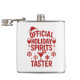 Quote: Official Holiday Spirits Taster. Red text. Decorated with glasses of wine, Santa's hat, coctail glass and snow crystals,