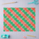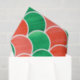 Wrap your Christmas stocking stuffers in stylish tissue paper featuring a reproduction of a hand-painted pattern. Rows of alternating red and green scales with white borders form diagonals of colour across the interlocking geometric pattern. Paint strokes are visible in the red and green fan shapes and show variations in the colours.