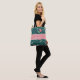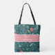 Custom all over print tote bag personalised with your monogram name and surname. This cute Christmas floral design consists of green and red winter leaves with mistletoe leaves and a red Christmas flower pattern on a dark green background with a light red stripe crossing it. Simply edit the design by clicking on "personalise this template" and change the text. The text will change on both sides at the same time.