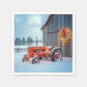 Red vintage farm tractor decorated with glowing white lights beside a rustic old barn adorned with a Christmas wreath in the snow