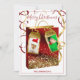 Cute red and gold gift bag with name tags photo placements. ‘Merry Christmas” script with your name in simple typography. Strands of red and gold ribbons streaming down over the gift bag. So festive.