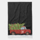 Retro red truck with Happy Holidays text and green Christmas tree.