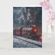 Old red steam locomotive with steam cloud and glowing red lights in a snowstorm.