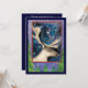 Vintage illustration Merry Christmas holiday design featuring a reindeer in a forest surrounded by stars in the night. The North Star is shining bright in the sky with trees in the background. He waits patiently for Santa Claus to need him to fly his sleigh on Christmas eve.