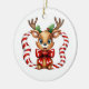 This Christmas ornament is shown with a cute festive holiday reindeer art print.