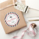 Affordable custom printed round return address stickers personalised with your family name, the year and your return address. This fun design features a striped background, reindeer graphic and modern rustic typography in red, white and charcoal grey colours. The text reads "Merry Christmas" in a trendy script font. Use the design tools to edit text fonts and colours to further customise your own unique holiday return address labels.