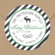 Affordable custom printed round return address stickers personalised with your family name, the year and your return address. This fun design features a striped background, reindeer graphic and modern rustic typography in green, white and charcoal grey colours. The text reads "Merry Christmas" in a trendy script font. Use the design tools to edit text fonts and colours to further customise your own unique holiday return address labels.