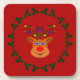 Image of a Christmas reindeer, surrounded by holly, on a dark red background.