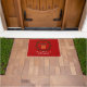 Image of a Christmas reindeer, surrounded by holly, on a dark red background.
