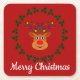 Image of a Christmas reindeer, surrounded by holly, on a dark red background.