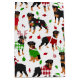 Cute Christmas Rottweiler dogs in festive holiday outfits. Rottweilers with black and tan coats hold candy canes, wear Santa hats, antlers, sweaters with scattered ornaments.