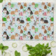 Cute Rough Collie dogs dressed in festive holiday outfits, Santa hats and argyle sweaters with scattered Christmas ornaments.
