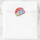 Red Christmas round sticker with Snowman and Snowfolk Winter Wonderland sledging. Sledding.