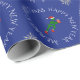 The text on this sport-themed wrapping paper is in white and can be edited for your preferred greeting, or simply use the supplied: "MERRY CHRISTMAS HAPPY NEW YEAR". The design shows a pictogram runner (in christmas green) wearing a santa hat and carrying a festive parcel. The background is navy, and there are golden-coloured snowflakes too.
